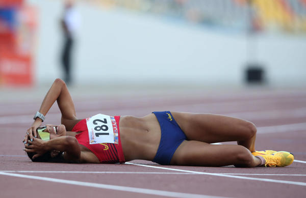 Edymar Brea celebra tras ganar la medalla de oro en la prueba de atletismo de 10.000 metros femenina en los Juegos Bolivarianos (Foto: EFE/ Paolo Aguilar)