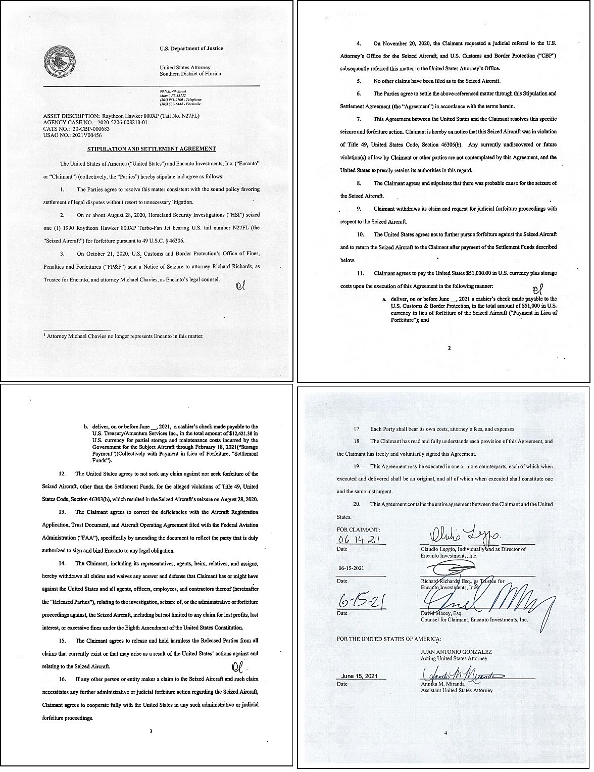 Como parte de los términos del convenio, la empresa vinculada a la familia Leggio realizó un pago bajo la figura jurídica de Payment in Lieu of Forfeiture (pago en lugar de decomiso), el cual cubrió además los costos de almacenamiento y custodia de la aeronave generados durante el periodo de retención. A cambio, el Gobierno de los Estados Unidos se comprometió a la devolución inmediata del activo y a desistir de cualquier acción legal futura relacionada con estos hechos específicos.